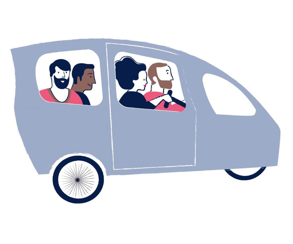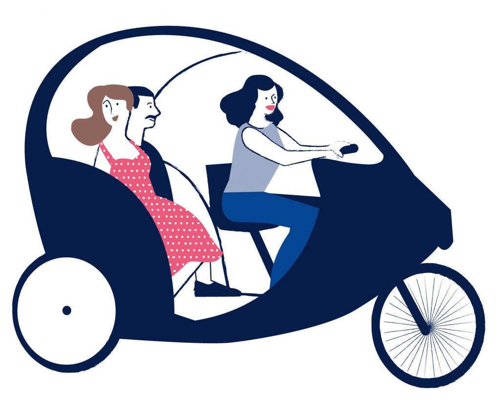 Il s’agit d’un tricycle dont la cabine est généralement à l’arrière, et pouvant transporter, généralement, 2 adultes et 1 enfant